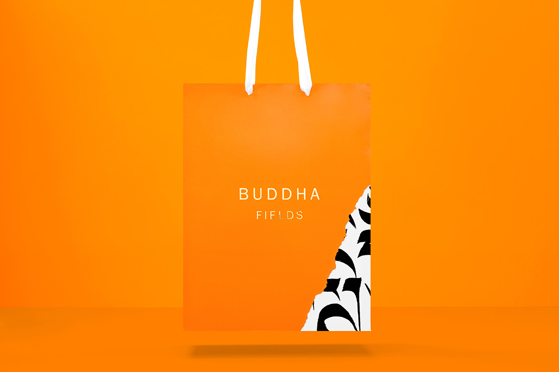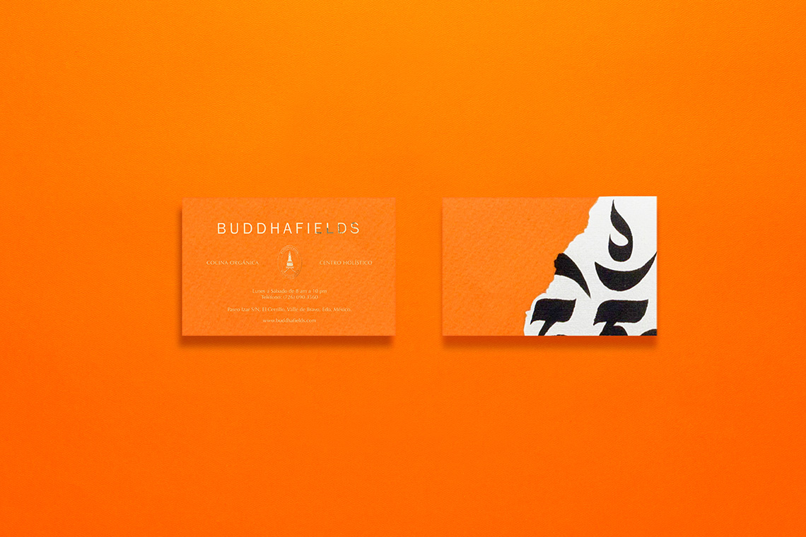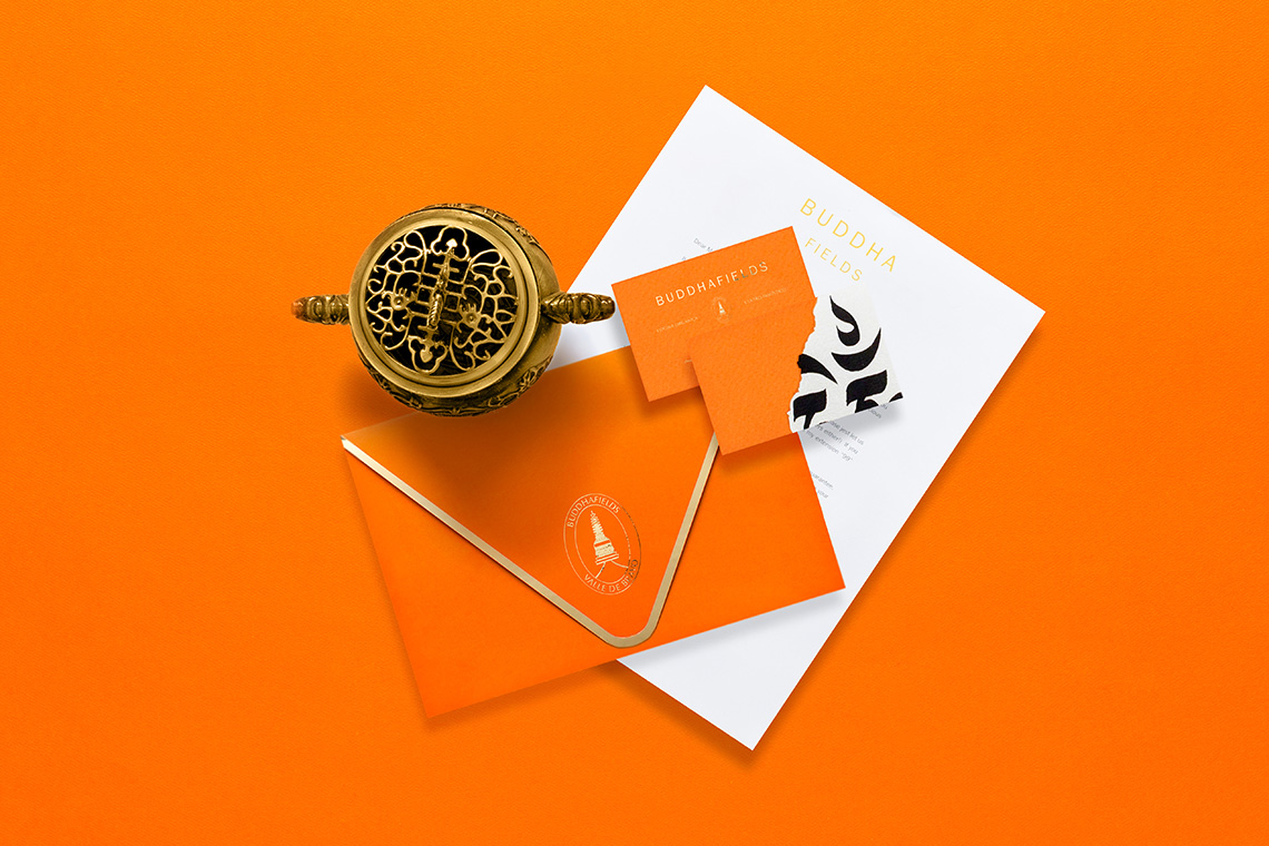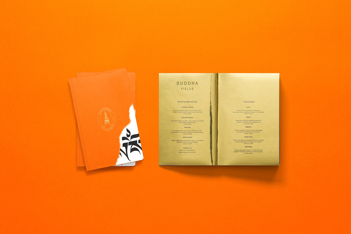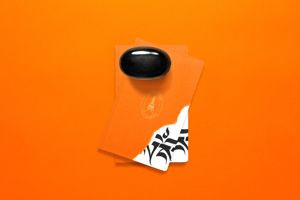Our design proposal is inspired by the delicate brush strokes of Tibetan calligraphy, which, together with the color palette, stimulate energy and warmth in the brand. The ripped paper detail reflects modernity, while the finely detailed traditional emblem provides balance, giving the brand the authority and sacred wisdom of Buddhist temples. — (A)