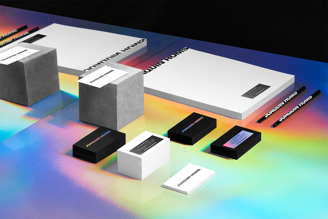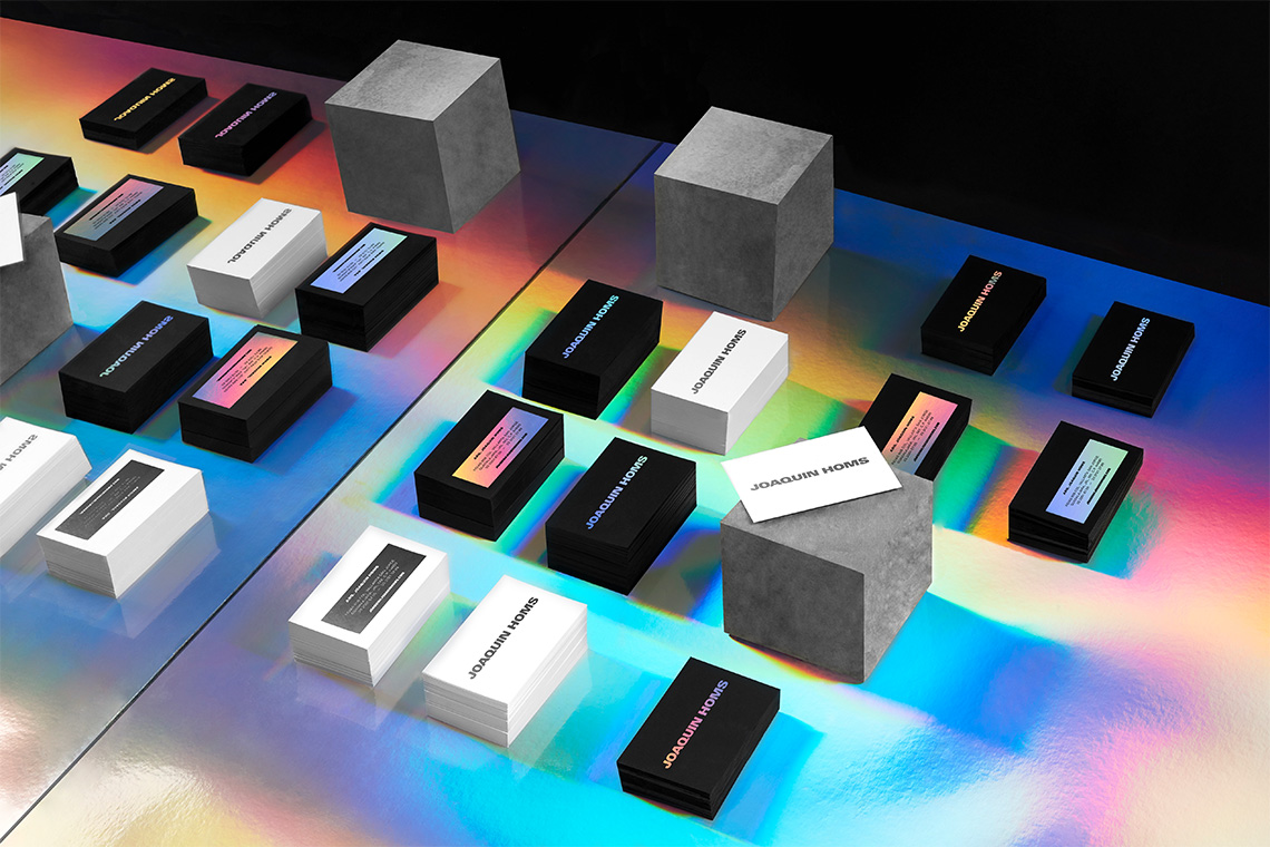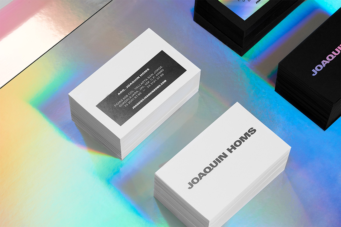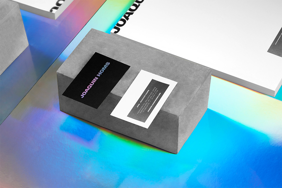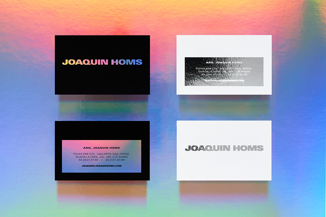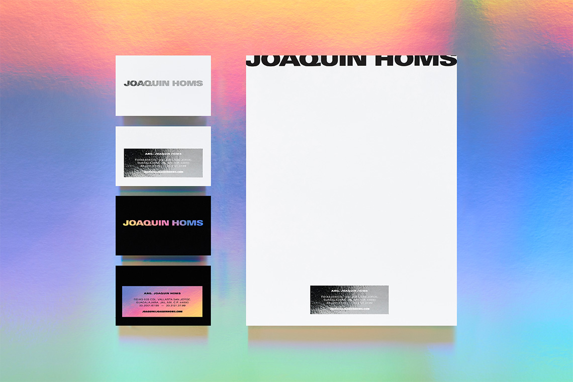 In a neutral and timeless brand behavior, the identity developed for this project, exemplifies Joaquin's work diverseness through a contrasting exercise employing typographic hierarchies as the guiding concept. The logo typography is custom made, representing the architecture studio as a fashion design house. Employing a neutral color palette allows Homs portfolio variety to be distinct. Holographic and metallic details highlight the contemporary touches prominent in his work. — (A)