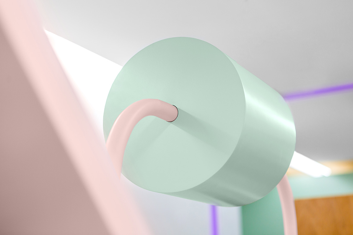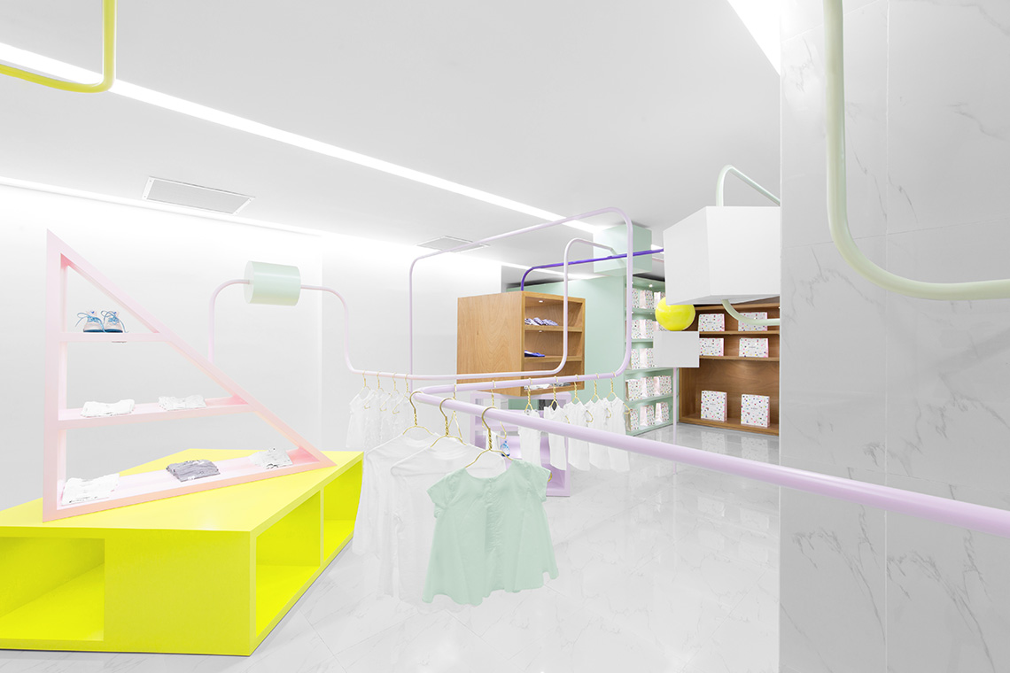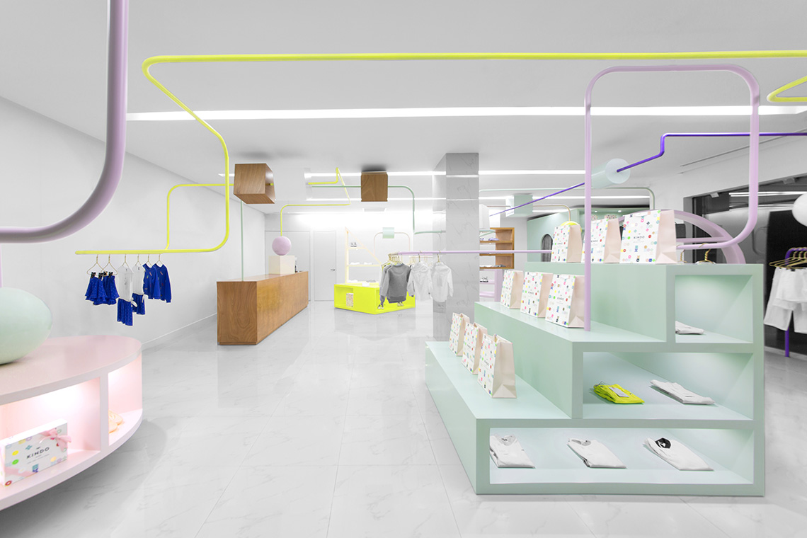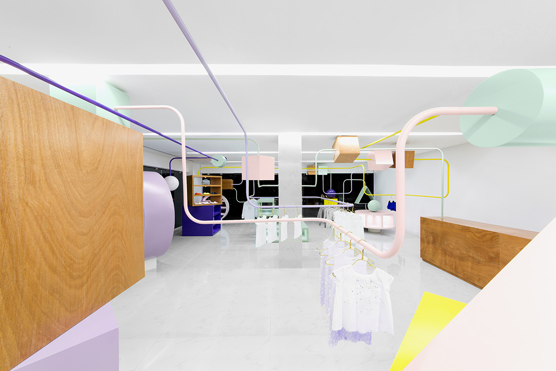 The store’s interior aims at complementing the experience for adults as well as children. It creates a dynamic space where each of the bead maze’s attributes are used for the products’ exhibition. The tubes function as display stands for clothing and the beads are used to exhibit an array of accessories. The interior achieves its function as a unique space that perfectly complements the brand’s style. — (A)