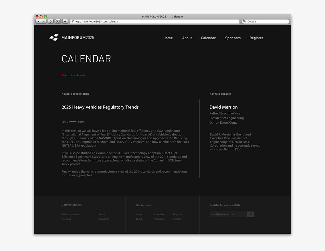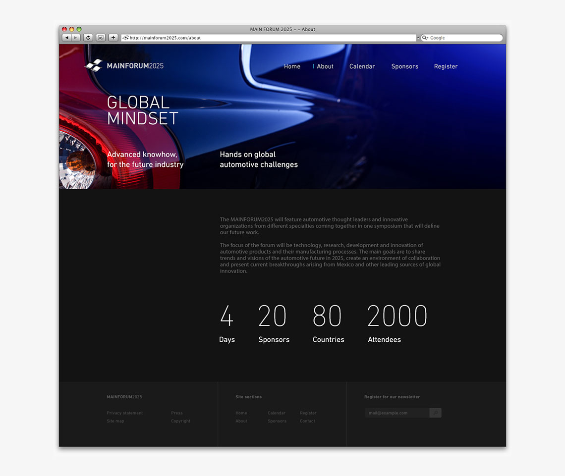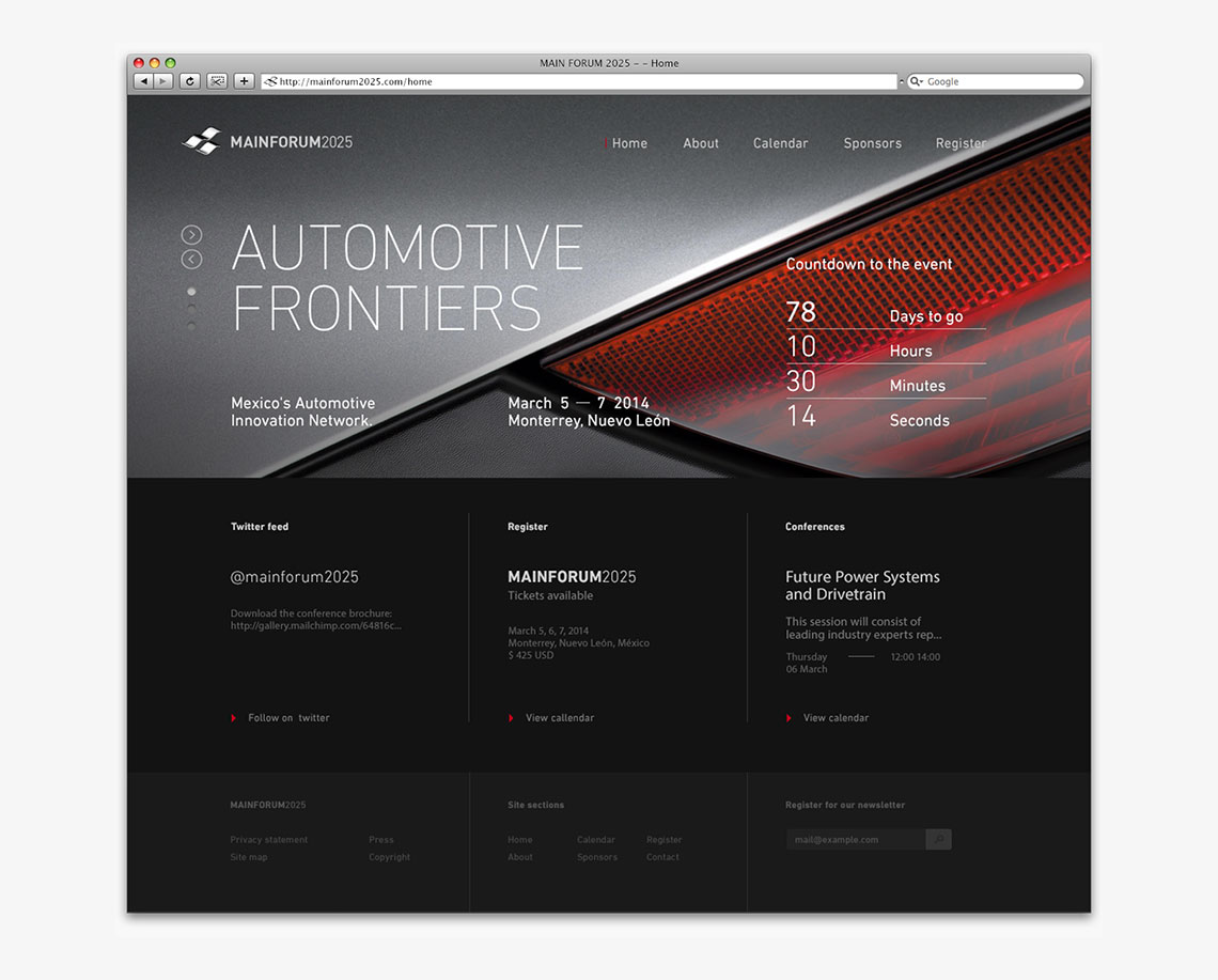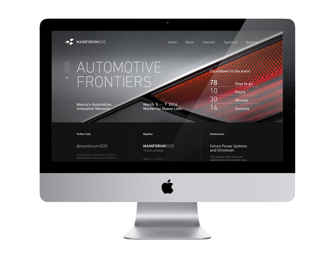 The logo, based on an abstract mix of chromed automobile emblems and auto racing flags, provides clarity towards Main Forum 2025's main theme of automobile technology. Its three-dimensionality is meant to convey the forum's vision of growth by sharing information on the future of technology in the automobile industry. For the website, our first objective was to create an immediate visual impact that would immediately take the themes of technology and automobiles and expand on its own aesthetic manifestation. Our second, and most important objective, was to create a very practical site that would not only inform on the forum and present its calendar, but that would also make it very easy to register and pay online.
