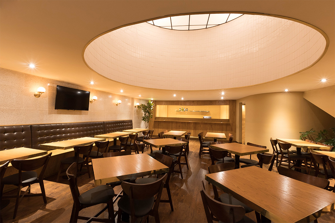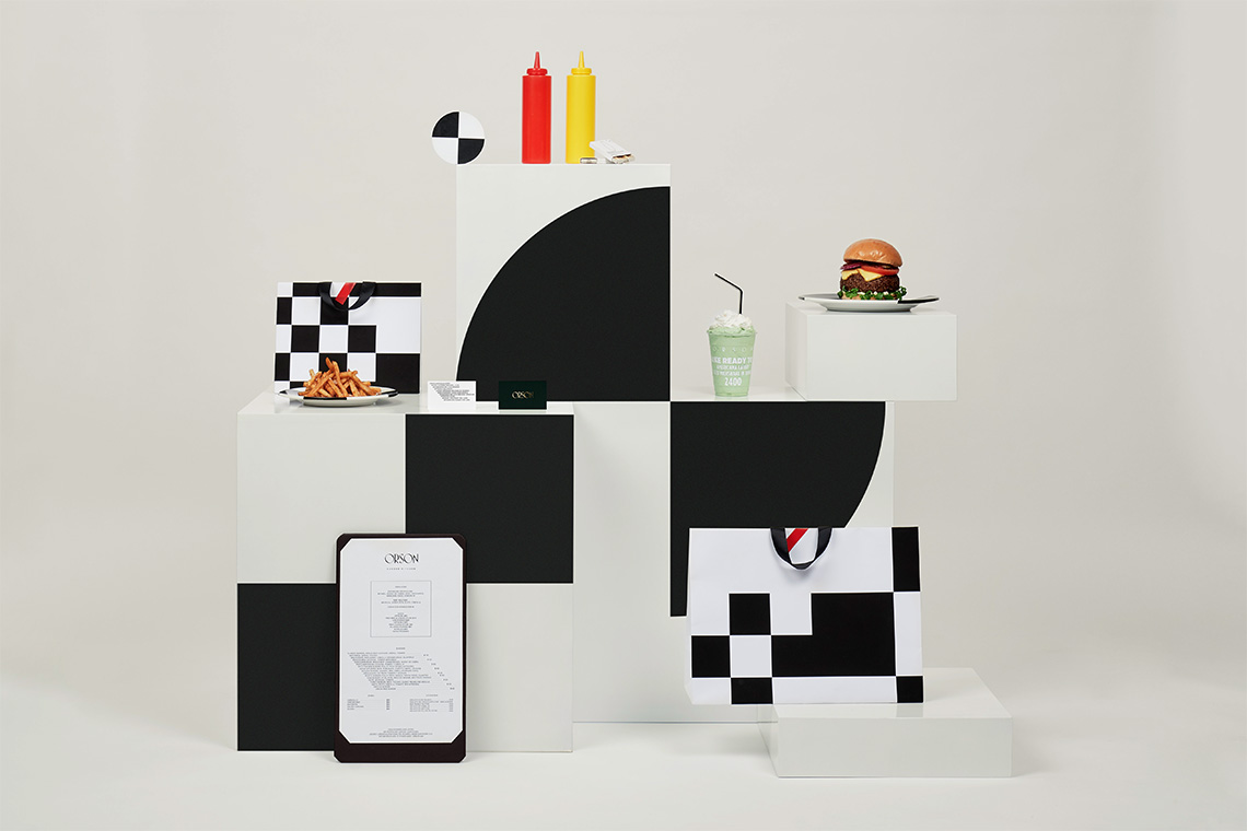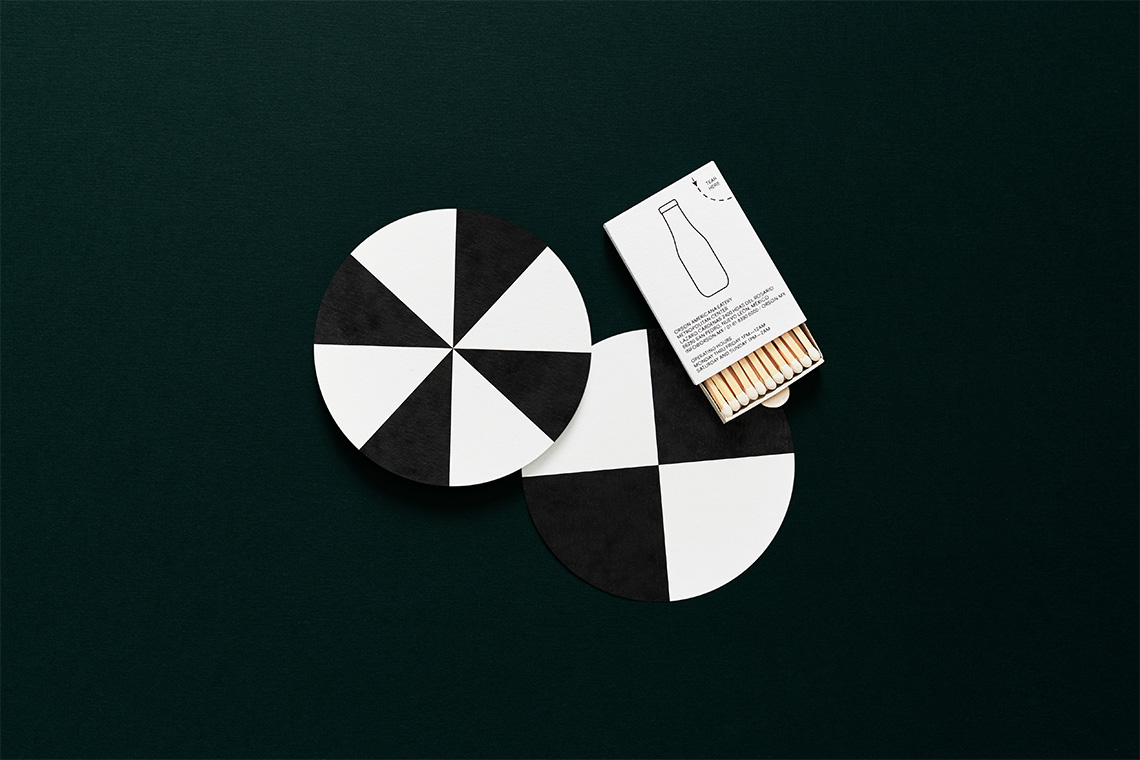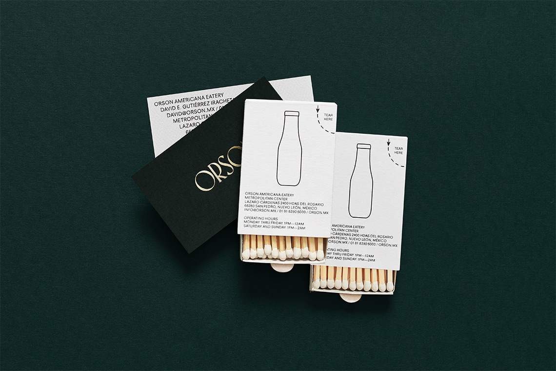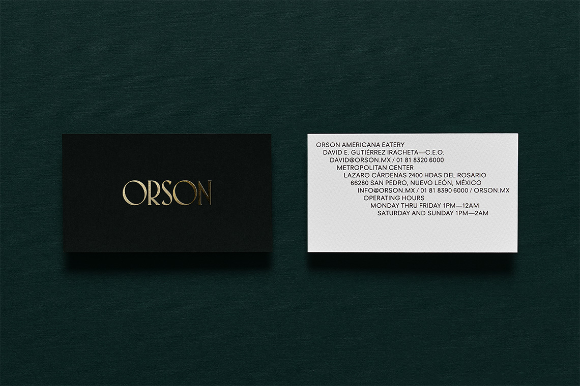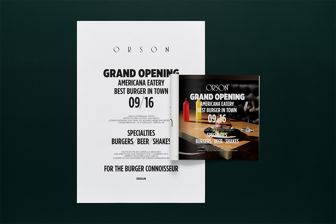 The graphical identity is consistent with the proposed architectonic style employing dark and contrasting colors. The typographical system is responsible for the modern touch to the brand. The logo is custom made and its expression is based around the Art-deco style in the same manner as the restaurant's furniture and architectural detail — (A)