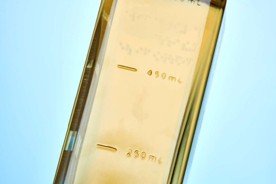 The bottle stands out for its relief composed by the identity icon, the bottle content's volume in milliliters and a legend in Braille.