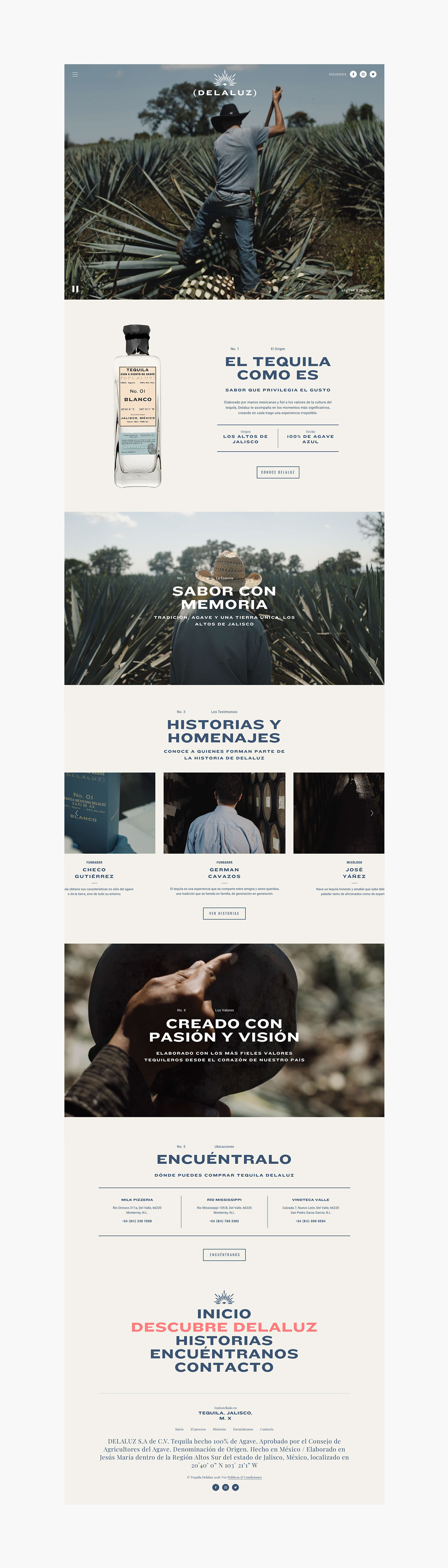 For the digital identity of Delaluz, we worked on the UI / UX, front-end and back-end development. We managed to capture the brand typographic layouts to the digital medium, preserving its legibility while exhibiting the different types of tequila that are produced in Delaluz. We additionally added a section that showcases the development of Tequila through the processes and production characteristics. The site's typography is mainly composed up of Knockout for titles and Roboto for body texts. — (A)