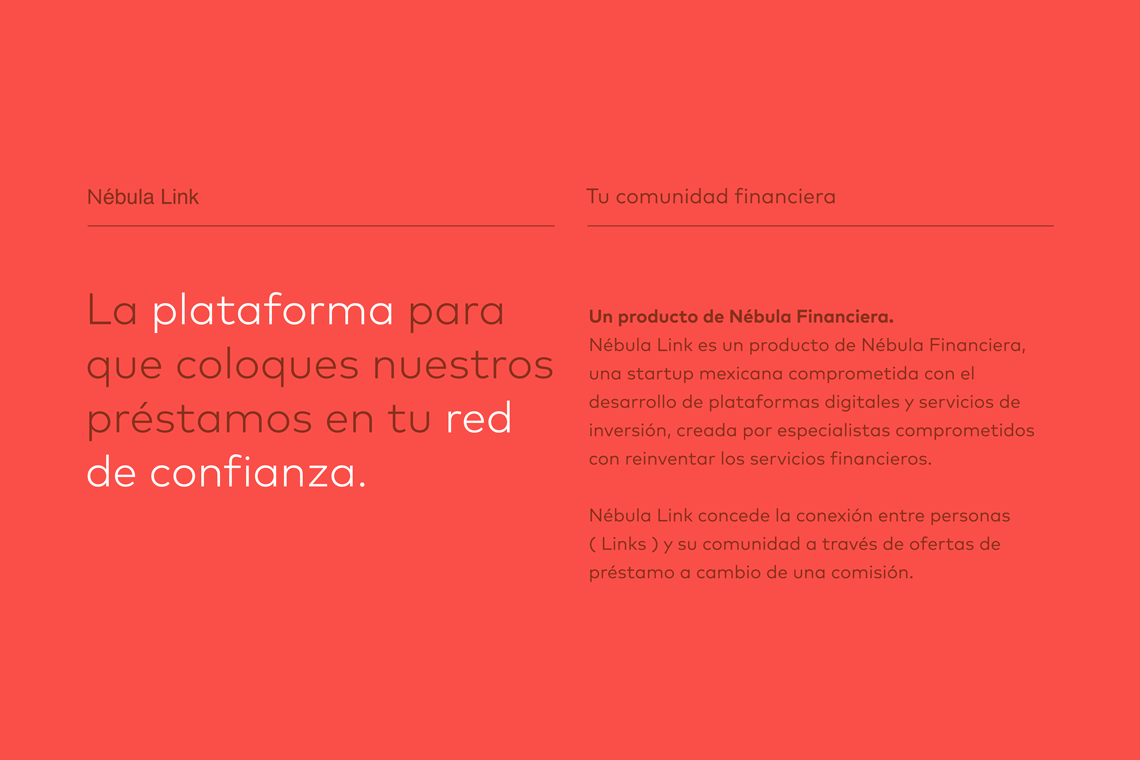 Nébula Link is a product by Mexican startup Nébula Financiera, commited to the development of digital platforms and investment services created by specialists devoted to reinventing financial services. Nébula Link concedes the connection of people with their community through loan offers in exchange for a commission.