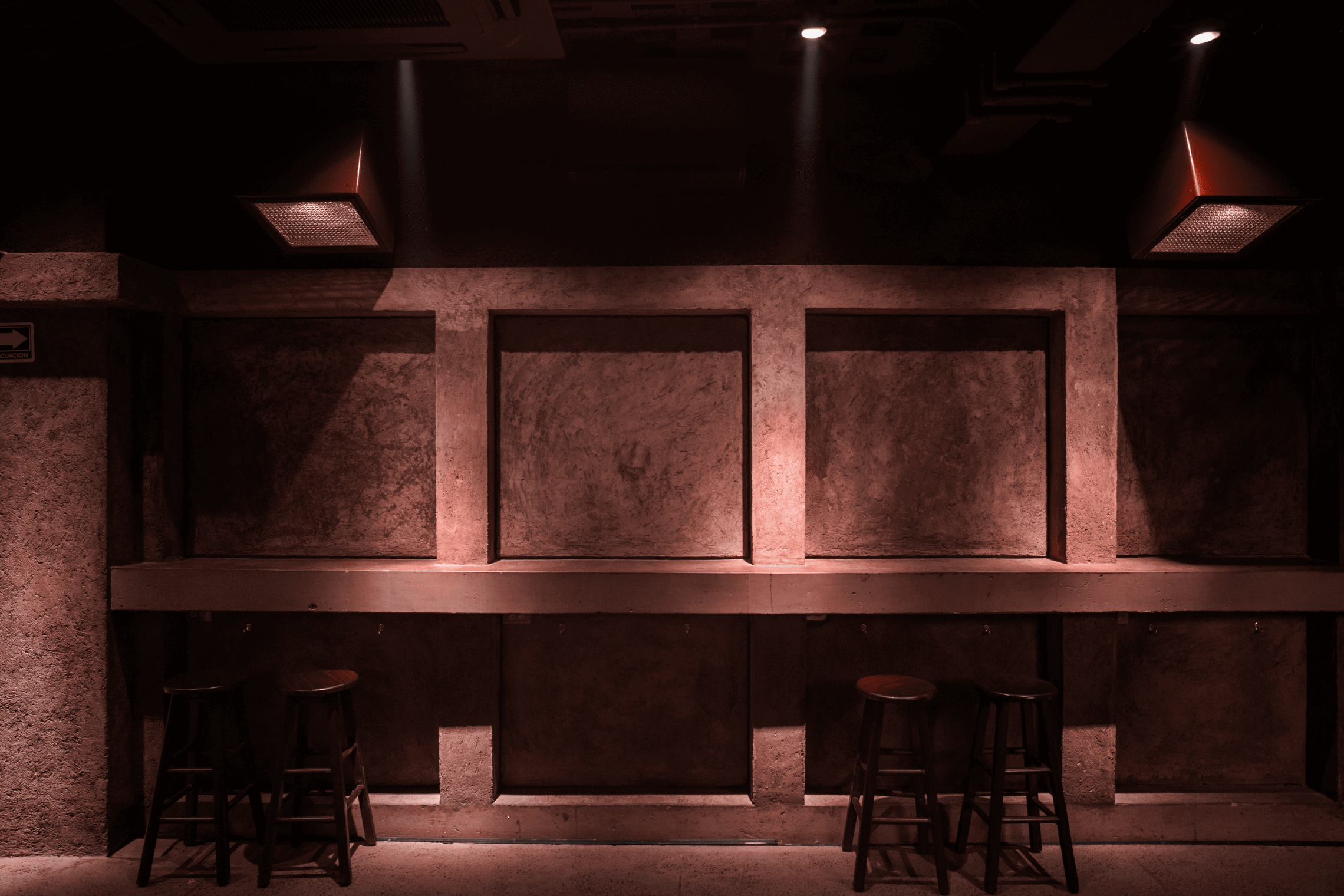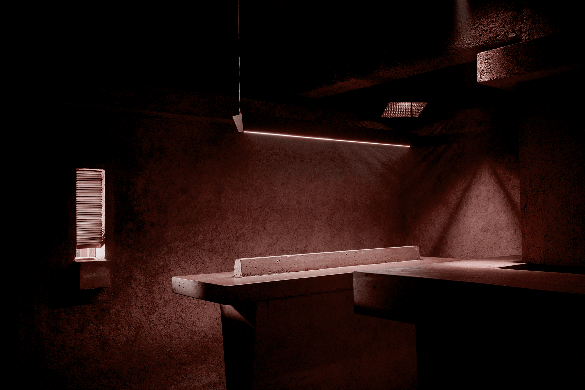 The architecture of the place is inspired by the feeling transmitted when entering a pre-Hispanic tomb and by the modernist architecture of Mexico City. As part of the interiors we decided to pay a special tribute to the sculpture from the Mesoamerican Classic Period titled: Disc of Death for its simplicity and geometric sophistication. The piece was commissioned to Tezontle Estudio. — (A)